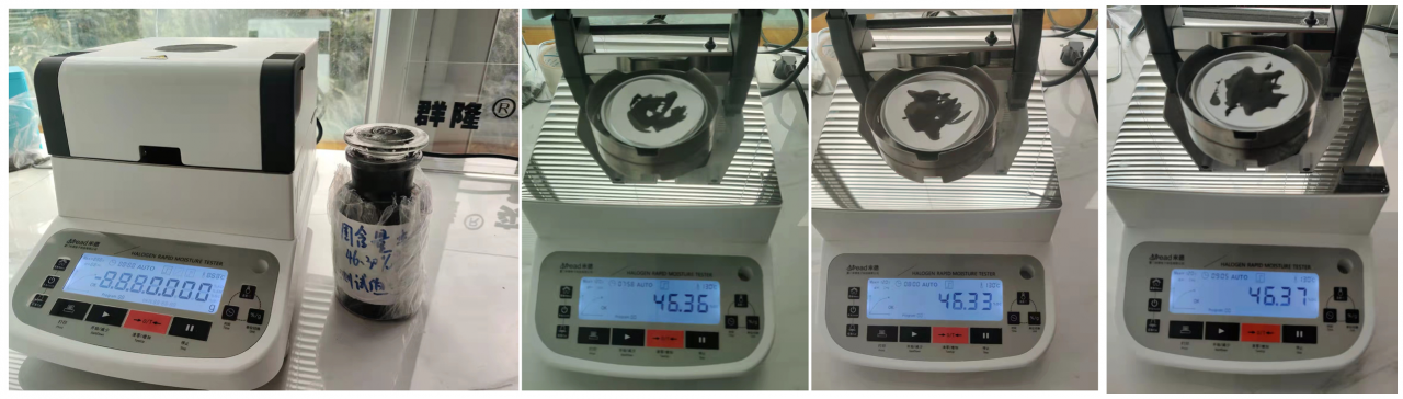 - 復(fù)位儀器,待儀器冷卻至40℃以下后,再取等量的漿料均勻涂在玻璃纖維紙上,重復(fù)上述測(cè)試步驟;測(cè)試結(jié)束后得出第二組數(shù)據(jù),顯示樣品的固含量為46.33%;第三組數(shù)據(jù),固含量為46.37%;根據(jù)客戶提供的參考數(shù)據(jù)46.30%,實(shí)際測(cè)試誤差小于客戶給出的誤差±0.5%,表示測(cè)試結(jié)果可靠,可重復(fù)性好。