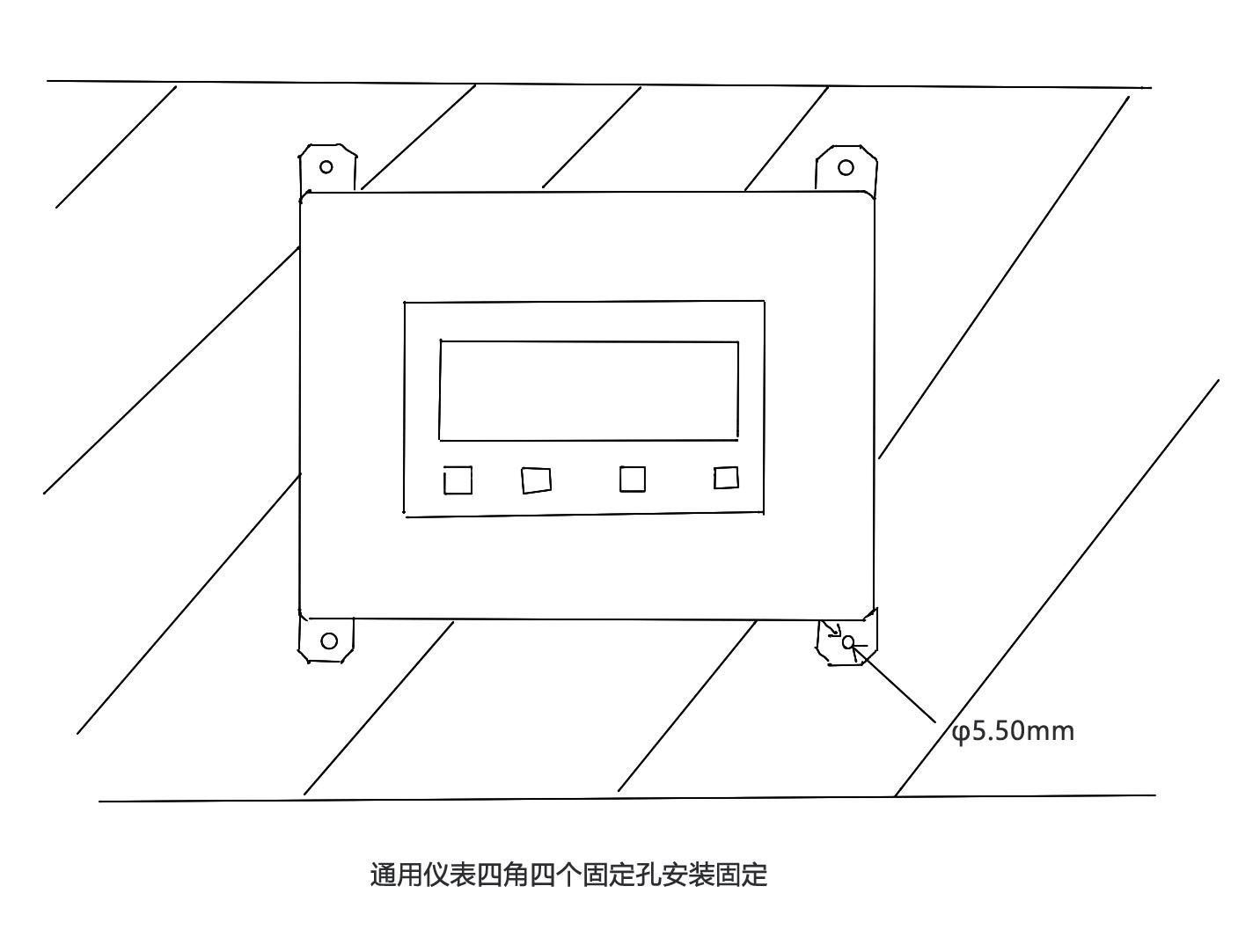 儀表可以通過四角四個(gè)固定孔進(jìn)行安裝固定,安裝在墻面或者生產(chǎn)儀表設(shè)備上,例如可以安裝在生產(chǎn)設(shè)備槽鋼支架上。