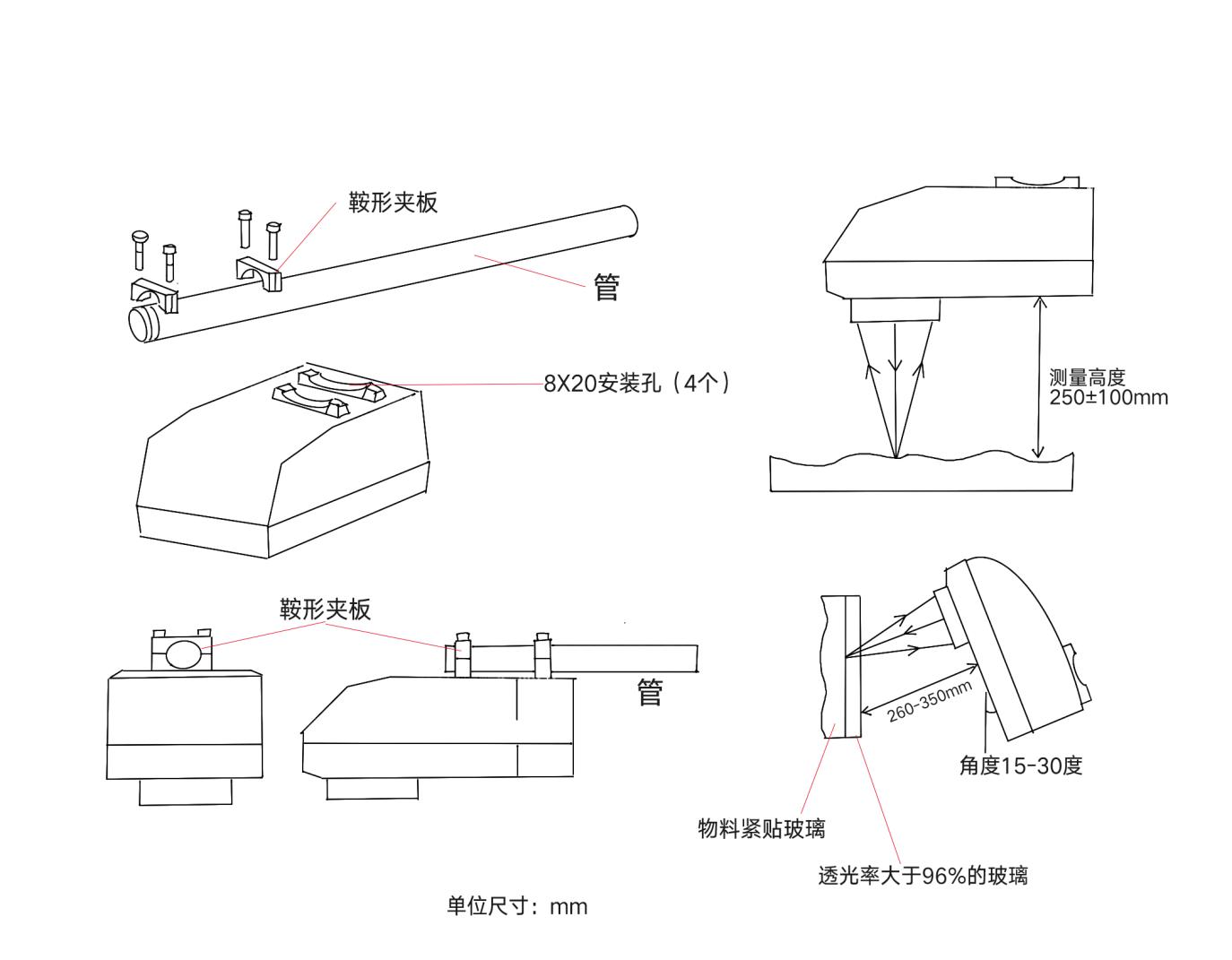 安裝支架根據(jù)工況自行定制,安裝圓管直徑25-32mm